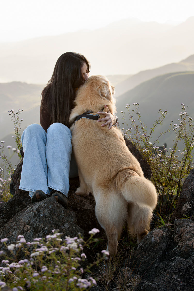 Muitas vezes, a correria do dia a dia faz com que os detalhes passem rápido demais, mas na fotografia eles se eternizam: um abraço e nada mais, o Simba apenas descansando ao seu lado. O carinho entre os dois estava ali o tempo todo, em cada gesto sutil. Foi um momento divertido, leve e que me permitiu conectar não só com o Simba, mas também com a Marina.